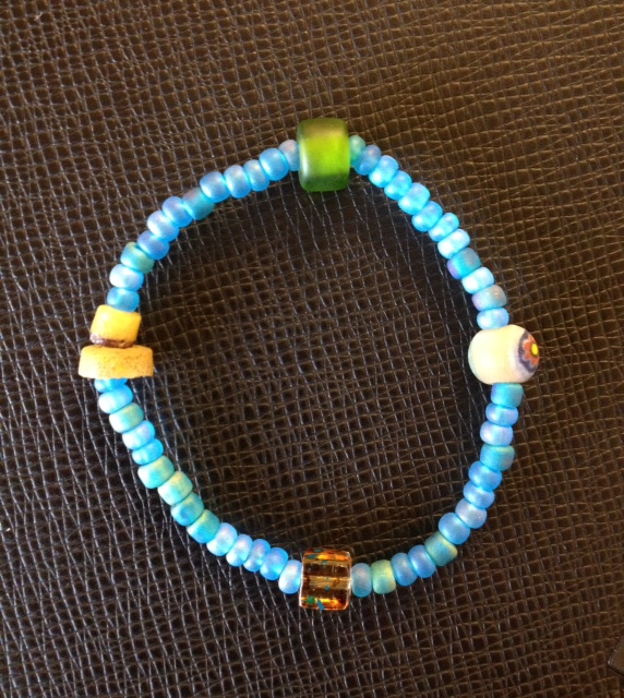 Here’s the bracelet I made to remind me to work on this. The blue beads are for the walls in the room. The Green bead at the top is the green shawl from Jesus, to remind me that He is there with me. Going clockwise, the white bead is me. It has two millefiori on it, one on either side. The square brown bead represents the chair. The broken-looking beads represent the “stuff” that created the need for the room. They are made from recycled glass from Africa.