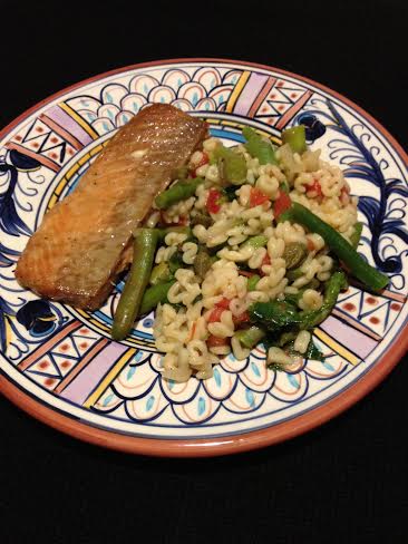 When the cilantro and the tomato wilt, add this mixture with the asparagus and the green beans into the pot with the pasta, and dress with olive oil.
