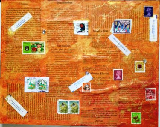 Background of canvas was painted the weekend my mother-in-law was dying. It symbolizes the transition from material to spiritual space.