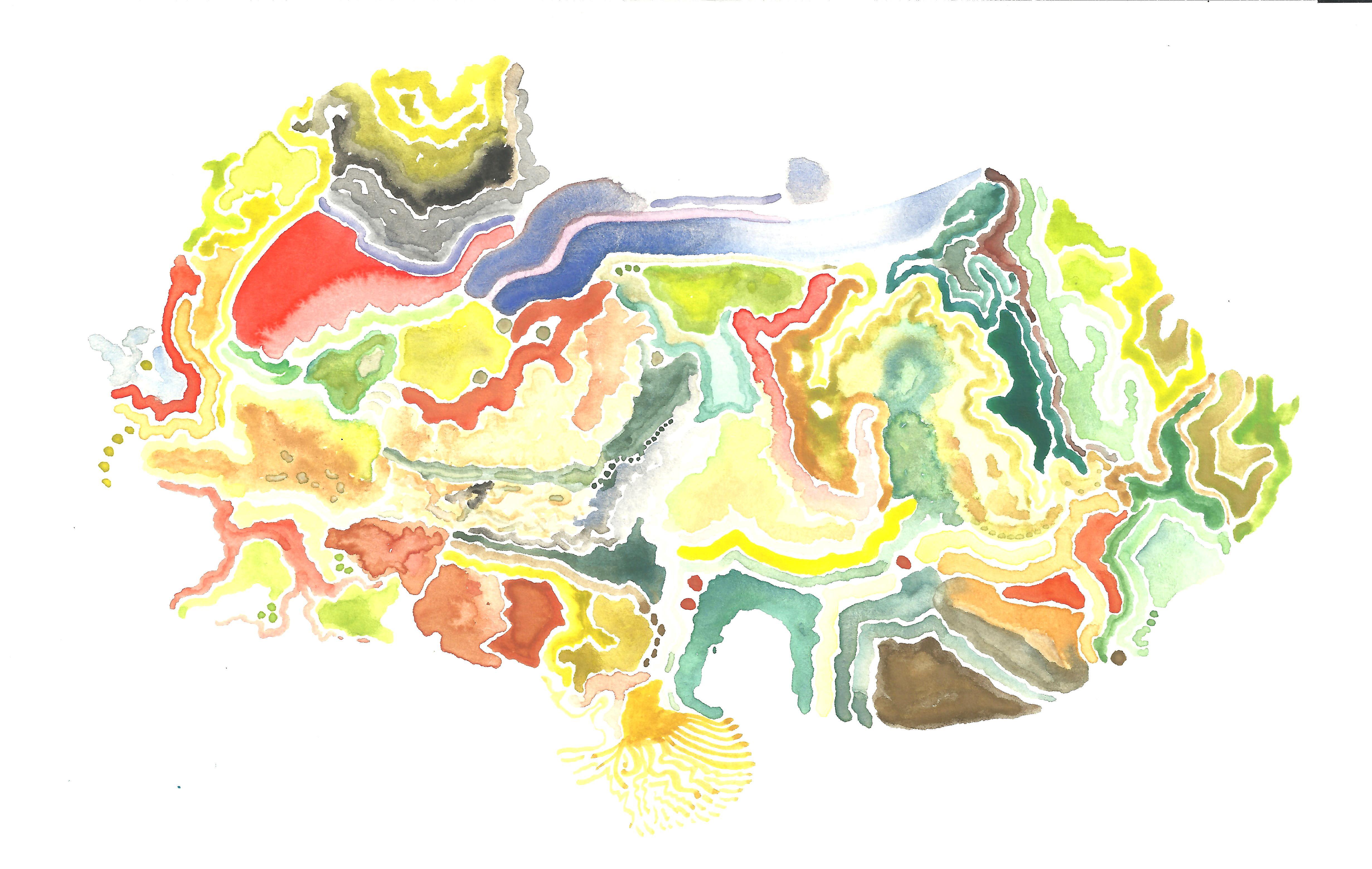 I mostly let my mind go free and “filled in the blanks” on a blank piece of paper. I selected color moment by moment. There was no pre-sketching or planning. This took a little over an hour to do. I kept another piece of paper nearby to write the words for what I was seeing/remembering/being inspired by. I think of it as a sort of memory map that works both ways. It shows me where I have been and shows me where I’m going, and something more.