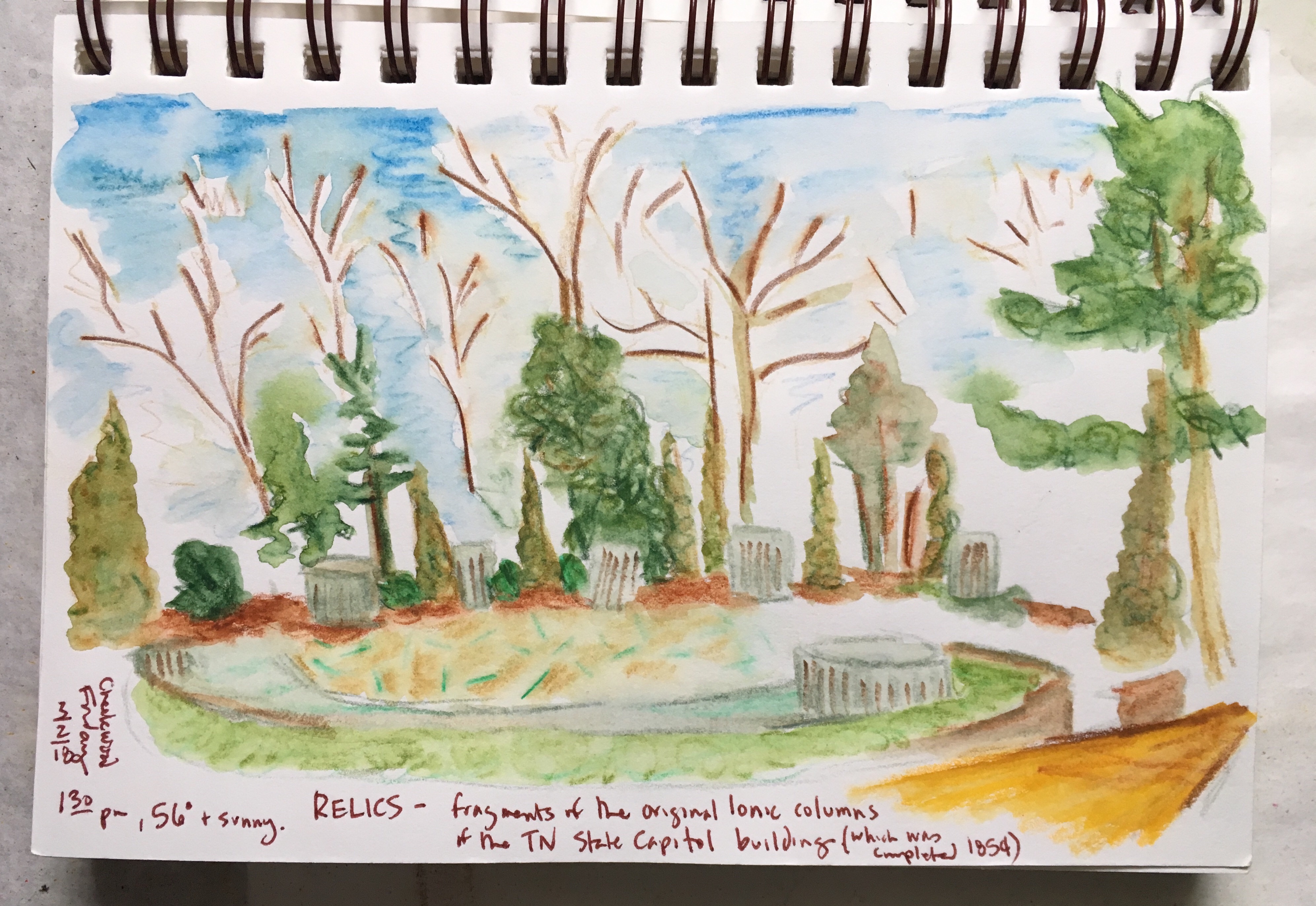 The initial sketch of the “First Ladies” – (this one is Abigail Adams) and the wreath-laying ceremony are on the same page. This is before I have added more color and water.