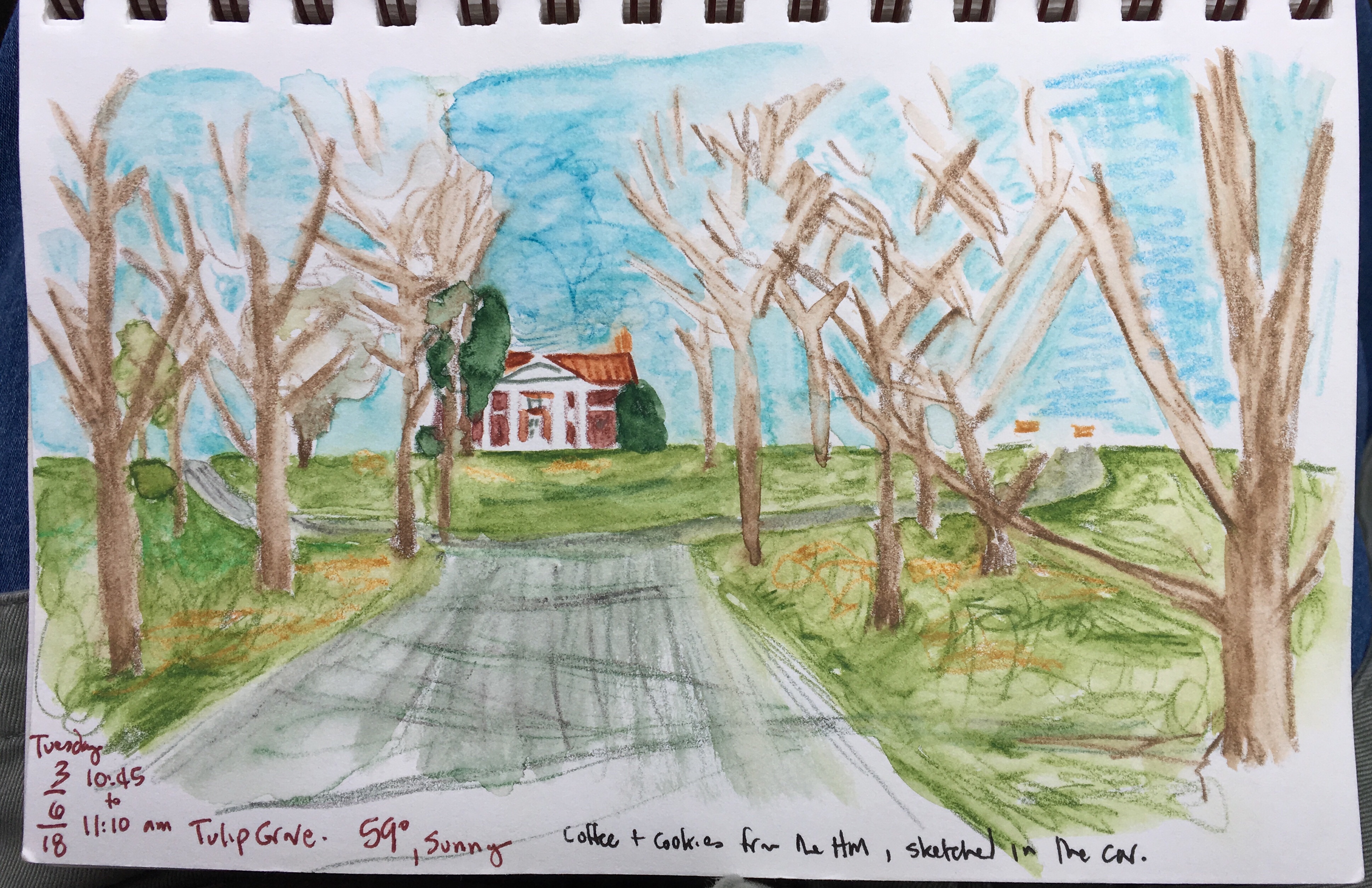 I have previously asked several different employees about sketching inside the mansion, since photography is strictly forbidden. Nobody has said that I couldn’t. I didn’t have an opportunity to ask again since the docent was busy, so I began sketching in the small lobby that connects the overseer’s office and the study. I also sketched upstairs during the lecture, and took notes since the history of the place and family is fascinating. The docent noticed me and asked what I was doing. I showed her the sketch. She was pleased and continued with her speech.
