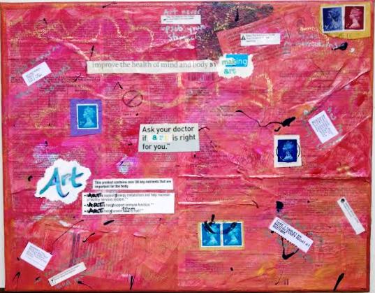 Acrylic paint, gold oil pastel pencil, under-words from a prescription insert for a nose spray, warning labels from prescription bottles, magazine clippings, label from a box of multi-vitamins stamps, silver and black Sharpies, decoupage glue, rubber stamps, ink, watercolor.