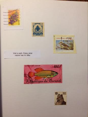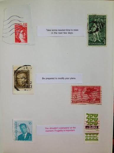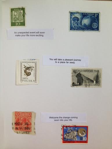 I’ve got a lot of stamps, and a lot of fortune cookie messages. The stamps were easy to come by – I bought bags of them from craft stores. The fortune cookies weren’t so easy. I like Chinese food. I eat it at least once a week. And once a week I get a fortune. I get a little overwhelmed when I think of how many meals my collection of fortunes represents.