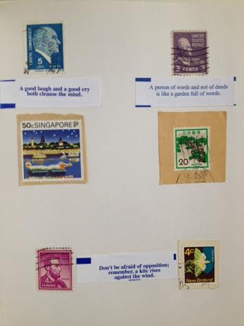 I spent most of yesterday sorting my stamp collection and my collection of fortunes from fortune cookies. I have a slightly disturbing amount of both. Fortunately they are tiny paper things, so having a lot of them doesn’t take up a lot of space. I pulled out ones I liked as I was sorting, with no particular idea what I was going to do with them. At night I knew – put some of them together with this picture. It is like a postcard of memories.
