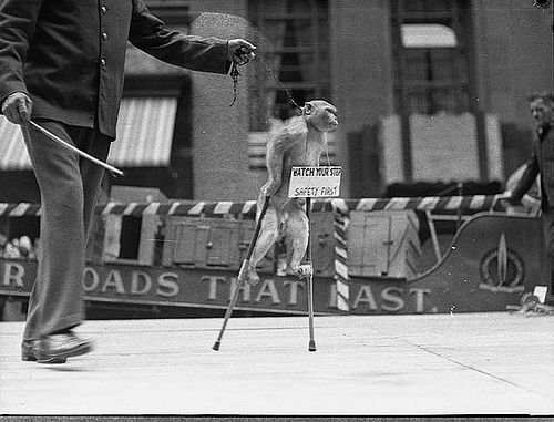 And yet they weren’t citizens. Unable to vote, to marry, to own property, they were beneath the law, an invisible slave workforce. Their owners thought nothing of it. Why would they? They collected all their salary without having to provide any more than food and lodging, both of which were minimal for their charges. When pressed by members of the Monkey Liberation League (whose motto was “Monkeys are People too!”) they would bring up the expense of training and clothing, saying that the fees had yet to be recouped. When pressed further, they hemmed and hawed about exactly when that date would be reached. They’d say things like “Well you see, new uniforms have to be custom-made, and that don’t come cheap. They tear up their clothes so often, you see. And then there’s the hats. You can’t imagine how expensive they are, and they lose them all the time. Just when the debt is about paid up, there they go needing something else again. Why, they should be grateful we take care of them at all, as much bother as they are.”