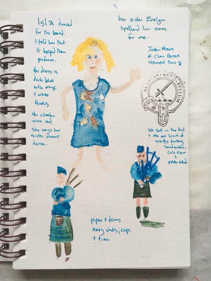 The initial sketch of the “First Ladies” – (this one is Abigail Adams) and the wreath-laying ceremony are on the same page. This is before I have added more color and water.